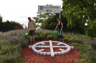 Pünktlich zum Sommer, dem anstehenden Burggartenfest und natürlich dem nächsten Erntedankfest hat der Förderverein Erntedankfest und Brauchtum beschlossen, den Ortseingang von Heidesheimer zu verschönern. Das in die Jahre gekommene Heidesheimer Wappen war zwischen Unkraut kaum noch zu erkennen und die Lavendelpflanzen zum Teil vertrocknet. Henry Hofrichter und Jana Passoke ergriffen sofort die Initiative. Gekauft wurde rotes Rindenmulch, weiße Farbe für die Steine, einige neue Lavendel und schon ging es los. Wir finden, das Ergebnis kann sich sehen lassen. Der Ortseingang erstrahlt wieder in all seiner Pracht und heißt jeden freundlichst willkommen. Wir danken auch für die Wasserspenden, damit die Pflanzen den trockenen Sommer unbeschadet überstehen.