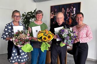Katja von Puttkamer, Gabriele Bruckmann und Burghard Müller-Dannhausen erhalten von Eveline Breyer (v.l.n.r.) ihre Urkunden und Blumensträuße, Bild: Stadtverwaltung Ingelheim
