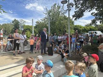 Die umfassend sanierte und neu gestaltete Spiel- und Parkanlage „Stevenagestraße“ öffnete am Montag, den 8. Juli 2024, feierlich ihre Tore für die Öffentlichkeit. Bei herrlichstem Sommerwetter strömten zahlreiche Kinder, Familien, Anwohner und Senioren zur Eröffnung. Zu Beginn sangen Kinder der Kita „An der Burgkirche“ und des „KGH Süd“ das Lied "Wer hat die Kokosnuss geklaut", passend zum Jungle-Thema unter welchem der Spielplatz gestaltet wurde. Nachdem Oberbürgermeister Ralf Claus, Bürgermeisterin Eveline Breyer und Beigeordnete Christiane Döll jeweils einige Worte zur Begrüßung und zum Prozess der Sanierung gesprochen hatten wurde die Aufregung bei den kleinen Besucher*innen immer größer. Als schließlich das Absperrband fiel“ stürmten sie begeistert die neuen Spielflächen und -geräte.