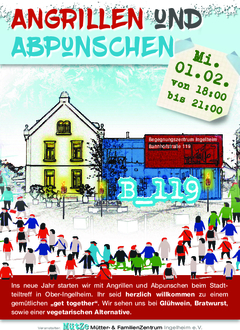 Am Mittwoch, den 01.02.2023 starten wir mit Angrillen und Abpunschen ins neue Jahr. Ihr seid herzlich willkommen zu einem gemütlichen „get together“ mit Gegrilltem, wie z.B. Bratwurst und einer vegetarischen Alternative und dem vorerst letzten Glühwein. Wir sehen uns ab 18 Uhr im Stadtteiltreff B_119 auf dem Platz vor der MütZe, Bahnhofstraße 119 in Ober-Ingelheim.