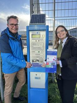 Beigeordnete Dr. Christiane Döll (rechts) und Bernd Velten, Leiter des Ordnungs- und Standesamts freuen sich über die neue Bezahlmöglichkeiten für das Parken in Ingelheim.