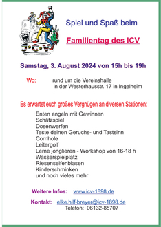 Am Samstag, 3. August 2024 ist es wieder so weit. Zum dritten Mal lädt der Ingelheimer Carneval Verein 1898 e.V. im Rahmen seines Sommerfestes von 15 bis 19 Uhr zum Familientag ein. Unter dem Motto „Spiel und Spaß für Groß und Klein“ wird es rund um die Vereinshalle in der Westerhausstraße 17 in Ingelheim viele Aktivitäten teilweise auch mit Gewinnen geben.