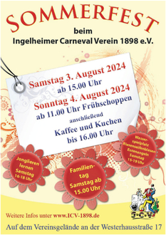 Der Ingelheimer Carneval Verein 1898 e.V. lädt am 3. und 4. August 2024 zum traditionellen Sommerfest rund um das Vereinsgelände in der Westerhausstraße 17 in Ingelheim ein.