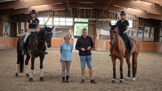 Dressurehrgang im Ingelheimer Reiterverein e.V. bei Experte Rolf Petruschke. Von links nach rechts: Ella Heinrichs auf Hotspot, Heidi Henckel, 1.Vorsitzende des IRV, Lehrgangsleiter Rolf Petruschke, Julia Densborn auf Krümel