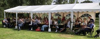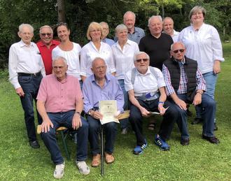 Zunächst standen die Ehrungen langjähriger – und erfreulicherweise auch neuer – Mitglieder auf dem Programm. Bei strahlendem Sonnenschein und launigen Sprüchen wurden Urkunden und Präsente überreicht und Küsschen verteilt. Auch ein Lied, extra für die Geehrten umgetextet, wurde vom Chor präsentiert.