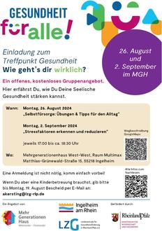 Die Kontaktdaten des Mehrgenerationenhaus (MGH) Ingelheim sind: Matthias-Grünewald-Str. 15; Tel. 06132 898040; info-mgh(at)ingelheim.de; weitere Infos: www.mgh-ingelheim.de, auf Facebook unter https://www.facebook.com/MGHIngelheim oder Instagram mit Benutzernamen: mghingelheim