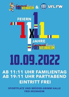 Am 10.09.2022 feiert der Carneval-Verein Frei-Weinheim sein Jubiläum 11×11 Jahre, das pandemiebedingt um ein Jahr verschoben werden musste. Eine Besonderheit: Der CVFW feiert seine 121 Jahre gemeinsam mit dem VfL Frei-Weinheim im Rahmen eines Familientages und eines Partyabends auf Sportplatz und in der Halle der Brüder-Grimm-Schule. Beide Vereine sind eng verbunden und wollen sich zukünftig stärker bei Veranstaltungen unter die Arme greifen. Bereits beim 100-jährigen Jubiläum des VfL im letzten Jahr halfen die Aktiven des CVFW. Nun hilft der VfL gerne. Beide Vereine freuen sich auf einen tollen Tag mit vielen Besuchern und ausgelassener Stimmung.
