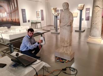 Alexander Kroth von der Firma baermedia erstellt einen 3D-Scan der Grabfigur, der später als Vorlage für die digitale Rekonstruktion des römischen Grabmonuments dient.