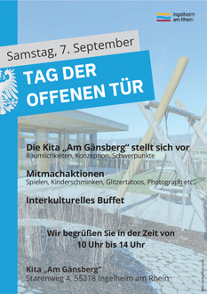 Am Samstag den 7. September 2024 öffnet die Kita „Am Gänsberg“, im Starenweg 4, von 10 bis 14 Uhr ihre Türen.