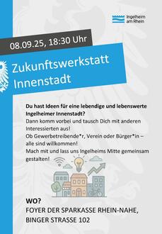 Die Stabstelle Wirtschaftsförderung, Stadtmarketing und Tourismus der Stadtverwaltung Ingelheim am Rhein lädt am 8. September 2025, um 18:30 Uhr alle Ingelheimer Bürger*innen herzlich zur „Zukunftswerkstatt Innenstadt“in das Foyer der Sparkasse Rhein-Nahe in die Binger Straße 102, 55218 Ingelheim ein.