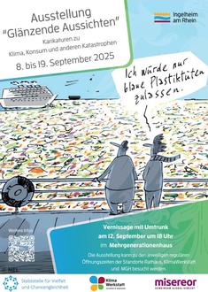 Die Stadt Ingelheim zeigt vom 8. bis 19. September 2025 die Karikaturen-Ausstellung „Glänzende Aussichten“ im Mehrgenerationenhaus. Einige Bilder sind auch im Interimsrathaus und der KlimaWerkstatt zu finden.