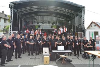 Der MGV 1866 vor seinem Auftritt. Vorne am Mikrofon 1. Vorsitzender Michael Gipmann; Udo Knab hinten rechts. Auf der Bühne: Schwabenheimer Musikverein.