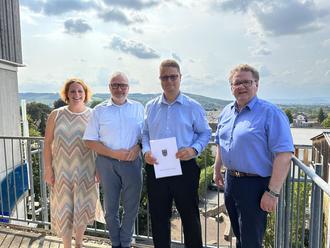 Auf dem Foto sehen Sie (v.l.n.r.): Nicole Gregori, Personalratsvorsitzende, Oberbürgermeister Ralf Claus, Jubilar Thomas Witza und Stefan Rolletter, Leiter des Hauptamtes.