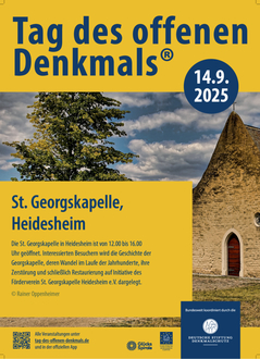 Zu dem „Wert-voll“ in Heidesheim gehört auch die St. Georgskapelle. Die Kapelle ist an dem Tag von 12:00 bis 16:00 Uhr geöffnet. Interessierten Besuchern wird die Geschichte der Georgskapelle, deren Wandel im Laufe der Jahrhunderte, ihre Zerstörung und schließlich Restaurierung auf Initiative des Fördervereins St. Georgskapelle Heidesheim e. V. dargelegt.