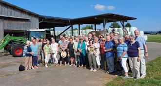 Anschließend fuhren wir weiter nach Schotten, wo uns der jüngste Sohn namens Emil der Familie Hampel (verheiratet mit Anna, geb. Rolletter aus Groß-Winternheim) auf dem Bio-Bauernhof begrüßte. In seiner lustigen Art erzählte er von den Arbeiten auf dem Familienbetrieb. Der Betrieb bewirtschaftet ca. 300 ha Ackerland und Wiesen. Rund 350 Stück Vieh grasen im Sommer auf den Weiden. Zu unserer großen Freude bekamen wir hier in angenehmer Atmosphäre unter schattenspendenden Bäumen Kaffee, Kuchen und kühle Getränke serviert.