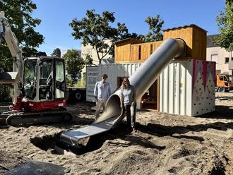Der umgebaute Seecontainer ist als Interimslösung gedacht und bietet sowohl für Kinder als auch für Jugendliche ein abwechslungsreiches Angebot. Neben zwei Rutschen, davon eine für Kleinkinder, gibt es auch eine Kletterwand, ein analoges Telefon aus Sprech- und Hörtrichter, Zerrspiegel, Balancierstämme und Kriechtunnel.