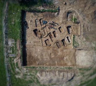 Drohnenfoto der Grabungsfläche an der Rotweinstraße im Frühjahr 2022 mit einigen bereits untersuchten Grabgruben aus dem Frühmittelalter.