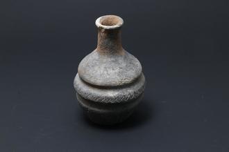 Diese ca. 16 cm hohe Flasche aus Keramik wurde 2022 in einem merowingischen Grab an der Rotweinstraße gefunden. Sie ist mit einem umlaufenden Zickzack-Muster verziert, an einer Stelle wurde ein x eingeritzt. Welchen Inhalt die Grabbeigabe hatte, ist unbekannt. Flaschen dieser Art sind in frühmittelalterlichen Gräbern äußerst selten, in Ingelheim bislang einzigartig.