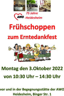 Wir laden ein zum Frühschoppen am Erntedankfestmontag, 3. Oktober 2022, ab 10.30 Uhr vor und in die Begegnungsstätte der AWO in Heidesheim. Feiern Sie am Tag der Deutschen Einheit das Heimatfest Erntedank mit Weck, Worscht, Woi und andere Snacks in unserer Begegnungsstätte und besuchen Sie auch die Festmeile rund um das Rathaus. Wir freuen uns auf Sie.
