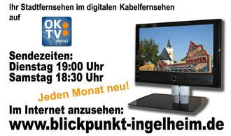 Weitere Ausstrahlungstermine, jeweils Dienstag gegen 19:00 Uhr und Samstag gegen 18:30 Uhr auf OK:TV im Kabelfernsehen. Das Stadtfernsehen Blickpunkt Ingelheim ist seit über 20 Jahren ein ehrenamtliches Projekt vom Stadtmarketingverein Lebenswertes Ingelheim e.V.
