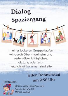 Der Dialogspaziergang lädt alle Generationen, auch gerne mit Hund, zur gemeinsamen Unterhaltung, Spaß und Bewegung ein. Wir laufen durch Ober-Ingelheim, reden über Alltägliches, können Fragen stellen und machen unterwegs mindestens zwei Pausen, da wir auf alle Teilnehmer*innen Rücksicht nehmen!