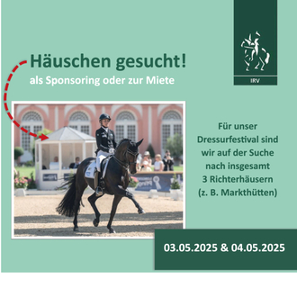 Für das Dressurfestival vom 03.05.- 04.05.2025 sucht der Ingelheimer Reiterverein drei Richterhäuschen. Dies können zum Beispiel Markt-, Wein- oder Obsthäuschen sein. Wir erwarten Reiter und Reiterinnen sowie zahlreiches Publikum aus Rheinland-Pfalz, Hessen und dem Saarland. Der IRV freut sich über Sponsoring – entsprechende Banner können an den Hütten oder am Reitplatz angebracht werden. Der IRV könnte die Hütten aber auch mieten. Die Häuschen müssten gegebenenfalls schon einen Tag vorher zur Verfügung stehen, da die Prüfungen voraussichtlich bereits am 03.05.2025 beginnen. Angebote gerne unter info@irv.de.