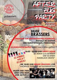 „After-Zug-Party“ ins Festzelt. Dafür haben wir eine Top Band verpflichtet. Die Bruise Brassers spielen bereits ab 18:00 Uhr Hits von den 70er Jahre bis zu den aktuellen Charts. Die 9-köpfige Band überzeugt duch hochprofessionelle Sänger und satter Rhythmusgruppe, abgerundet mit groovigen Bäsersätzen.