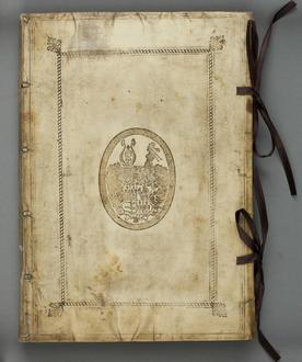 Einband von Sebastian Münsters »Fürmalung und künstliche Beschreibung der Horologien, 1544, mit dem Wappen der Grafen Fugger-Kirchberg-Weißenhorn«, © Stadt Ingelheim, MbdK, Inv. Nr. 2/1993.