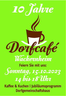 vor 10 Jahren wurde im Rahmen der Dorfmoderation zu dem Dorferneuerungskonzept unter anderem der Wunsch von den Bürgerinnen und Bürger nach einem Treffpunkt genannt. Dieser Wunsch wurde aufgegriffen und - anfangs - engagierten sich zehn ehrenamtlich tätige Bürgerinnen. Der Treff wurde zum Dorfcafé. Die Eröffnung war am 27. Oktober 2013 im Dorfgemeinschaftshaus. Zwischenzeitlich sind 22 Bürgerinnen abwechselnd ehrenamtlich tätig. Das Engagement der Aktiven rund um das wöchentlich geöffnete Dorfcafé findet zunehmend Interesse, auch weit über Wackernheim hinaus. Angeboten wird mittwochs nachmittags von 15 Uhr bis 18 Uhr auf Spendenbasis Kaffee, Kuchen, kalte Getränke und Geselligkeit. Die gespendeten Einnahmen werden an soziale Einrichtungen weitergeleitet.