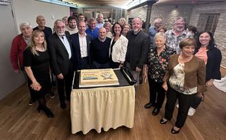 Dr. Joachim Gerhard, Vorsitzender des FIS, begleitet die Partnerschaft bereits seit Ende der 80er Jahre und freute sich besonders, dem Jubiläum beiwohnen zu können. Um die Freundschaft und die Erlebnisse darstellen zu können, hatte er zahlreiche Bilder aus der vierzigjährigen Geschichte zusammengetragen, die im Hintergrund gezeigt wurden. Als Überraschung überreichte er für den Partnerschaftsverein, im Namen aller Mitglieder, zum Jubiläum eine Torte, die zum Ende hin allen den Abschied versüßte.