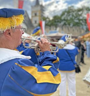 Im Anschluss übernahm die 78. Rotweinkönigin Sara I. (Sara Weitzel) das Wort und zog ein Resümee ihrer einjährigen Amtszeit. Es gab viele Worte des Danks, und auch manch eine Träne der Rührung verdrückten die Majestäten. Sie blickten auf ein spannendes Jahr zurück, das so manche Reise und jede Menge Begegnungen beinhaltet hatte. Sara I. dankte allen, die sie während ihrer Amtszeit begleitet hatten. Nach alter Sitte griff sie dann zur Krone und übergab sie der neuen Rotweinkönigin Laura I. Für diese war die Aussicht vom Balkon nicht ganz neu, stand sie doch gemeinsam mit Sara 2023 als Rotweinprinzessin der damaligen Rotweinkönigin Lina Weitzel zur Seite. Nachdem die Krone übergeben war, eröffnete Laura I. das 79. Rotweinfest. Begleitet von den Jahrgängen, dem Spielmannszug und zahlreichen Zuschauer*innen zog der neue Hofstaat zum Festgelände an der Burgkirche.