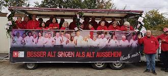 Unter dem Motto „Besser alt singen als alt aussehen“ haben wir mit einem Wagen voller rot gekleideter Sängerinnen und Sänger am großen Erntedankfest-Umzug teilgenommen.