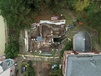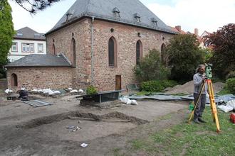 Blick von oben auf die laufende Ausgrabung im Synagogengarten von Worms.