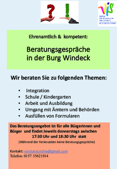 NEU: Ehrenamtliche Beratungsgespräche in der Burg Windeck! Viele Bürgerinnen und Bürger vermissen seit der Fusion mit Ingelheim eine Anlaufstelle für ihre Fragen. Wir springen in diese Lücke und bietet einmal in der Woche ein Beratungsgespräch an. Wenn Sie Schwierigkeiten beim Ausfüllen von Formularen haben oder nicht wissen, welche Behörde oder Anlaufstelle für Sie und Ihre aktuellen Probleme zuständig ist, helfen wir Ihnen gerne. Unsere Ehrenamtlichen nehmen sich Zeit für Ihre Fragen, beraten Sie oder leiten sie an entsprechende Stellen weiter. Die Beratung ist kostenlos und findet in der Schulzeit wöchentlich zwischen 17:30 und 18:30 Uhr in der Burg Windeck (Bahnhofstr 17, 1. Etage- Büro) statt. Sie erreichen uns über E-Mail oder Telefon (s.u.)!