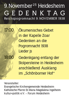 9.11.2025 Heidesheim Gedenktag zur Reichspogromnacht am 9.11.1938 von der Evangelischen Kirchengemeinde Heidesheim, Katholischen Pfarrei St. Maria Magdalena Ingelheim und kultur+politik e.V. – Forum Heidesheim