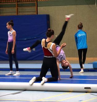 Hier lernen die Teilnehmerinnen und Teilnehmer akrobatische Elemente wie Rad, Überschläge und vieles mehr. Tumbling ist ein Sportangebot mit aktiver Hilfestellung und methodischen wichtig