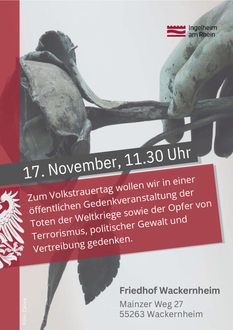 Anlässlich des Volkstrauertages am 17. November 2024 lädt Oberbürgermeister Ralf Claus alle interessierten IngelheimerInnen zur gemeinsamen Gedenkfeier auf dem Friedhof Wackernheim ein. Das Gedenken beginnt um 11.30 Uhr unter der Mitwirkung von Ortsvorsteher Theobald Paridon, den Wackernheimer Kirchengemeinden und Vereinen, den Musikfreunden Wackernheim und der Grundschule. Die Ansprache hält in diesem Jahr Sven Kutzner, Vorsitzender vom Verein Ingelheim-aktiv. Alle IngelheimerInnen sind herzlich eingeladen, der Gedenkveranstaltung beizuwohnen.