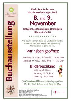 Am Samstag, den 08. November (15:00 Uhr – 18:30 Uhr) und Sonntag, den 09. November (13:00 Uhr – 17:30 Uhr) lädt die Katholische Öffentliche Bücherei Heidesheim herzlich ins Pfarrzentrum zur traditionellen Buchausstellung ein. Freuen Sie sich auf eine große Auswahl aktueller Bücher für Jung und Alt, darunter viele Neuheiten der Frankfurter Buchmesse. Bestellen Sie bequem Ihre Lieblingsbücher – auch Titel, die nicht auf der Ausstellung gezeigt werden - und entdecken Sie neue Leseschätze!