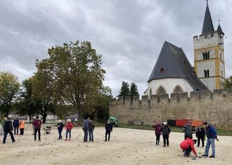 Der Ingelheimer Boule Verein hat sein traditionelles Supermêlée Turnier an der Burgkirche durchgeführt. Insgesamt jagten 77 Spielerinnen und Spieler dem Schweinchen, wie die kleine hölzerne Zielkugel genannt wird, nach. Dies stellte einen neuen Rekord in der Teilnehmerzahl dar. Die Mehrzahl der SpielerInnen kam aus dem gesamten Rhein Main Gebiet, die weiteste Anreise hatte dabei Dietmar Walloch aus Jever, der selbst aus Niedersachsen den Weg nach Ingelheim gefunden hatte.