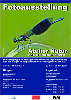 Eine gemeinsame Ausstellung der Fotogruppe im Mehrgenerationenhaus und der Binger Photogesellschaft wird in Bingen vom 2. bis 30. Dezember in Bingen „Im neuen Kunstraum“, Kapuzinerstraße 2 zu sehen sein. Ein fotografischer Streifzug durch die Natur wird hier gezeigt. Die Vernissage ist am 2. Dezember um 11 Uhr. Öffnungszeiten sind Dienstag, Donnerstag, Freitag 14 bis 18 Uhr und Mittwoch und Samstag von 10 bis 14 Uhr. In Ingelheim ist die Ausstellung vom 3. bis 25. Januar in der Sparkasse Rhein-Nahe, Binger Straße 102 während der Öffnungszeiten zu sehen. Die Vernissage ist am 4. Januar um 18 Uhr.