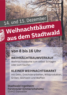 Der Weihnachtsbaumverkauf im Ingelheimer Wald findet in diesem Jahr am Samstag, den 14. und Sonntag, den 15. Dezember 2024, jeweils von 8 bis 16 Uhr statt. Es besteht die Möglichkeit, die Fichte selbst im Wald auszuwählen und zu fällen. Säge oder Axt sowie Handschuhe müssen selbst mitgebracht werden. Alternativ stehen auch bereits geschlagene Bäume am Jugend- und Freizeitheim Emmerichshütte zum Verkauf bereit.