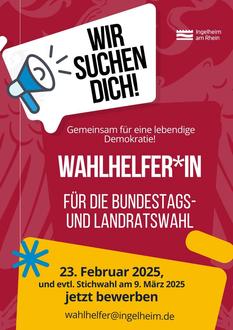 Für die Durchführung der bevorstehenden Bundestagswahl und der Wahl zur Landrätin/ zum Landrat sucht die Stadt Ingelheim am Rhein Wahlhelfer*innen, die in den 17 allgemeinen Wahlbezirken beziehungsweise den 34 Briefwahlvorständen mithelfen wollen.