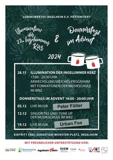 Freuen Sie sich auf die akustischen Livemusik-Abende unter dem Motto „Donnerstags im Advent“ am 5., 12. und 19. Dezember auf dem Sebastian-Münster-Platz - der stimmungsvolle Treffpunkt in der Vorweihnachtszeit! Die Konzerte werden ergänzt durch den „Budenzauber“ des Gewerbevereins Ingelheim aktiv auf dem Platz.