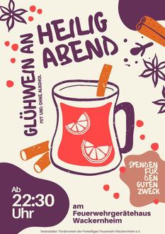 auch in diesem Jahr laden wir Sie an Heiligabend, zum alljährlichen Glühweinausschank ab 22:30 Uhr, am Feuerwehrgerätehaus ein. Neben Winzerglühwein werden wir auch selbstgemachten Früchtepunsch ausschenken. Der Erlös soll auch in diesem Jahr, einem gemeinnützigen Zweck zugutekommen.