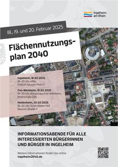 Die Stadt Ingelheim lädt alle interessierten Bürgerinnen und Bürger herzlich zu den Informationsabenden zum Flächennutzungsplan 2040 ein. Die Veranstaltungen sind identisch und werden zur besseren Erreichbarkeit in verschiedenen Stadtteilen angeboten.