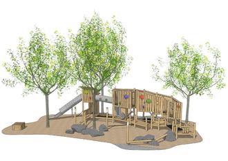 Die Spiellandschaft kommt – außer im Bereich des Rutschenauslaufs – ohne zusätzlichen Fallschutzbelag aus. Dadurch sind keine Bodenaushübe erforderlich, sodass die Baumwurzeln geschont und Eingriffe in den Boden minimiert werden.