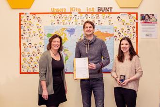 v.l. Susanne Clemen, Leiterin Kita Saalmühle, Hendrik Kammeyer vom Elternausschuss und stellvertr. Leiterin Denise Bednarek