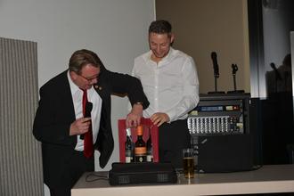Michael Gipman (links) dankt Falko Bajorat und überreicht ein Weinpräsent