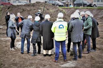 Am 31. Januar hatte die Hospizgruppe Unterstützende, ihre Mitglieder und die Nachbarn dieses Wohnviertels zum Spatenstich eingeladen. Die Menschen strömten in das in Erwartung der Gäste aufgebaute Zelt, das vor der Kälte, so gut es ging, schützte. Es waren rund 150 Menschen zusammengekommen. Man drängelte, man schob sich, man lachte, man freute sich. Da waren viele glückliche Gesichter, besonders beim Vorstand der Hospizgruppe. Die Vorsitzende, Dr. Maresa Biesterfeld, unterstrich für alle: „Dies ist ein ganz besonderer Tag“. In einem launigen Gedicht fasste sie gemeinsam mit ihrem Amtskollegen und stellvertretendem Vorsitzenden, Dr. Paul Hegemann, die Entwicklung der langjährigen Planung zu Gehör und in Erinnerung. Sichtlich stolz formulierte Oberbürgermeister Ralf Claus seine Glückwünsche mit der festen Zusage, auch weiterhin das zukünftige Hospiz zu unterstützen. Er wies darauf hin, welche Bedeutung die Errichtung eines Hospizes für jeden einzelnen habe, wenn die Kraft zur häuslichen Pflege nicht weiter ausreicht und an ihre Grenzen stößt. – Landrätin Dorothea Schäfer brachte ebenfalls ihre Glückwünsche zum Ausdruck und schloss sich seinen Versprechungen der Unterstützung an.