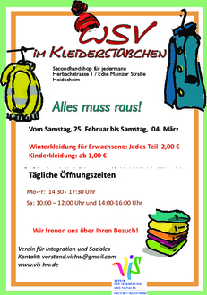 Winterschlussverkauf: Jetzt heißt es wieder: Alles muss raus! Im Zeitraum zwischen dem 25. Februar und 4. März ist unser Kleiderstübchen täglich zwischen 14:30 und 17:30 Uhr für Sie geöffnet. Sie können noch preiswerter als ohnehin schon üblich bei uns einkaufen. Übrigens: Die Angebote unseres Kleiderstübchens gelten nicht nur für Geflüchtete! Alle können zugreifen!